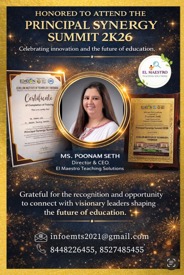 Ms. Poonam Seth, Founder Director & CEO of El Maestro Teaching Solutions, felt truly privileged to attend and be felicitated at the Principal Synergy Summit 2K26 held at Echelon Institute of Technology, Faridabad . The summit brought together distinguished educators and visionary thought leaders to explore innovation and the future of education, fostering insightful dialogue and meaningful collaboration.